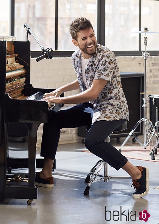 Pablo López luce camisa azul marino con estampado combinada con bermudas vaqueras de la nueva colección de Springfield.
