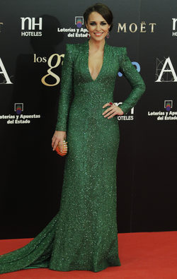 La actriz Paula Echevarría con un vestido verde de Dolores Promesas en la alfombra roja de los Premios Goya 2013.