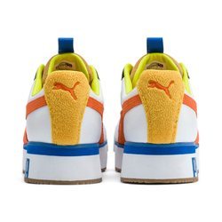 Parte posterior de ante en color amarillo de las clásicas zapatillas Roma Amor Sport con plataforma blanca de la firma Puma.
