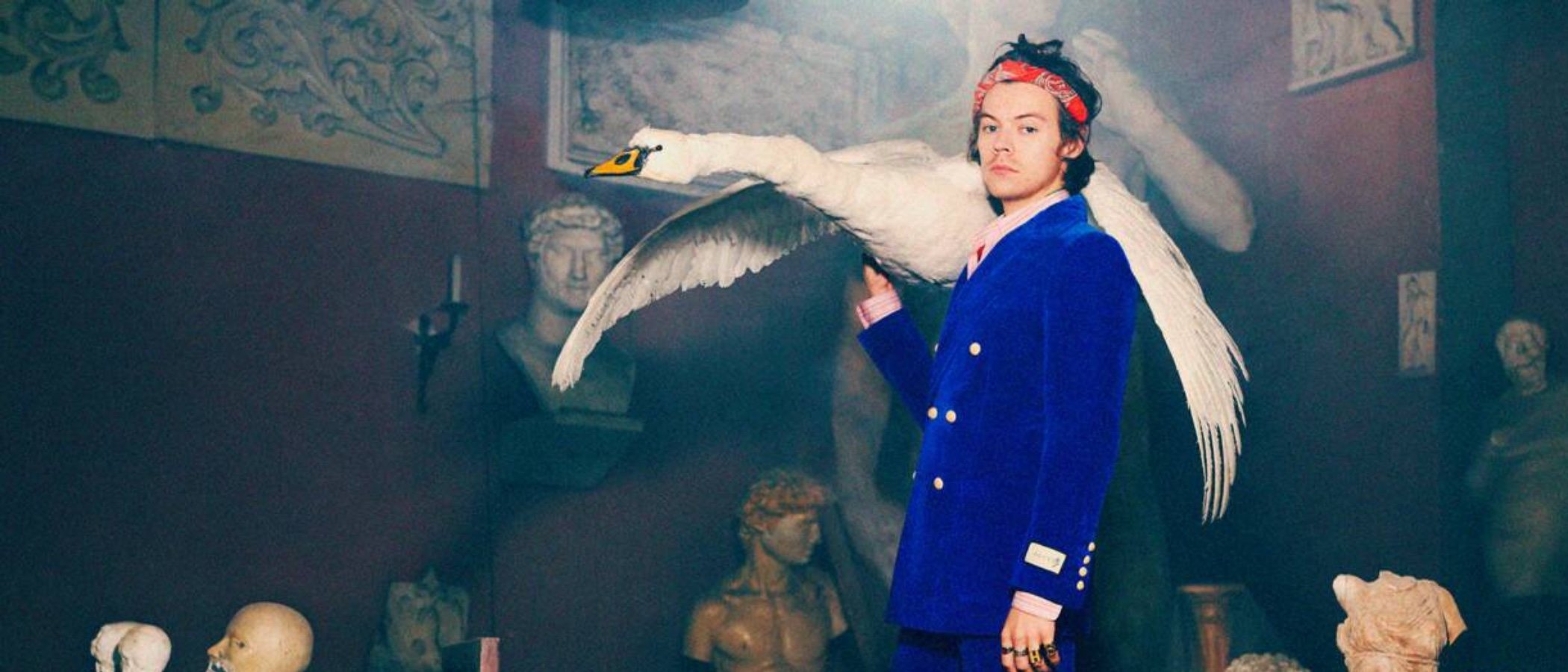 Harry Styles protagoniza la nueva campaña de la colección de otoño de GuccLas fotografías están hechas por Harmony Korine y en ellas vemos a Harry en una casa señorial abandonada, con un jardín en ruinas y rodeado por estatuas clásicas y algunos animales como cisnes, cerditos y flamencos. En los planos vemos al británico con camisetas debajo de las chaquetas sastre, chaquetas de colores y trajes de doble botonadura de terciopelo azul. Entre otros estilismos destaca una pieza muy característica del mismísimo Sherlock: las capas.