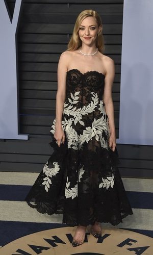 La actriz y modelo estadounidense Amanda Seyfried más conocida por su papel protagonista en 'Querido John' y 'Cartas a Julieta', no ha estado nada bien en la fiesta que se celebró tras la gala de los Oscar 2018 por Vanity Fair. Amanda Seyfried podía haberse sacado más partido a la hora de elegir su estilismo, porque desde luego con el que asistió deja mucho que desear. Un vestido por encima del tobillo con volumen en la parte inferior. La parte superior del vestido de palabra de honor era como una especie de corpiño. El tejido de encaje negro envuelve todo el vestido, sin olvidar el estampado de hojas en color blanco. La forma acampanada del vestido no dio resultado alguno. Los stilettos en color negro y transparentes suman algún punto al conjunto. El peinado con la raya a un lado y algo ondulado le da un toque sofisticado. Y el maquillaje con los ojos ahumados en colores marrones y un color de labios rojizo. Aunque el maquillaje y el peinado sean acertados no sirve de mucho porque el vestido es demasiado extravagante.