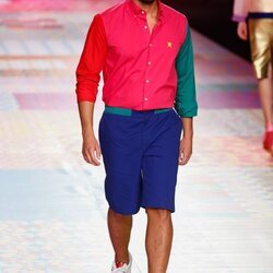 Gianmarco Onestini con un conjunto de rayas desfilando para Ágatha Ruiz de la Prada en la MBFW de MadridVolviendo sobre su propia historia y revisionando sus propios archivos, Ágatha Ruiz de la Prada dejaba claro que su éxito residía en una fórmula a la hora de diseñar que nunca falla y que hace que todo aquello que sale de su mente sea fácilmente reconocible sin necesidad de ver una etiqueta.