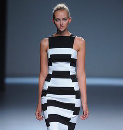 Casi la mitad de los modelos que ha presentado en la pasarela era en los tonos blanco y negro, eso sí, haciendo gran uso de las rayas para intercalar los colores. A veces ha empleado prendas de un solo color y otras a rayas bien marcadas o más finas, incluso empleando lunares que evocaban a vestidos de los años 70 pero con un aire de modernidad. Sandalias siempre negras con platafomra y algún bolso cartera negro con dos rayas blancas para no perder la esencia de esta temporada.