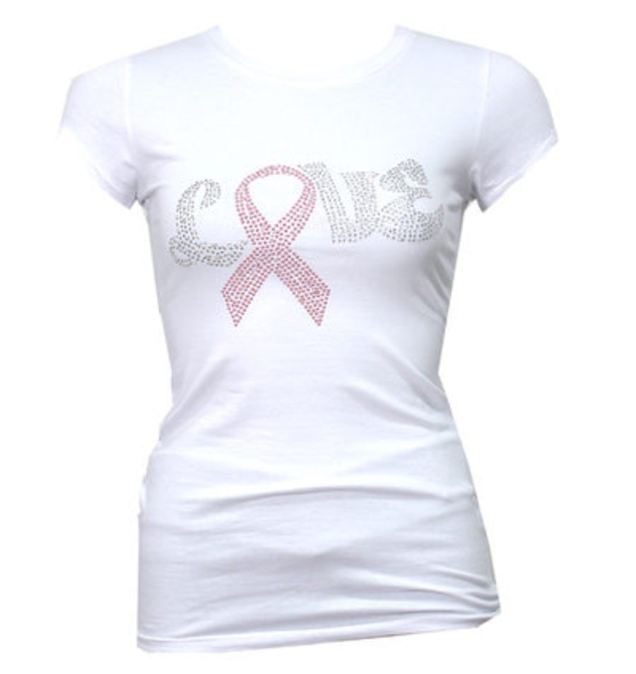 Camiseta Love Pink Ribbon de Barbarrella La prenda está especialmente diseñada para transmitir el mensaje de que todas las mujeres podemos luchar contra el cáncer de mama. Está elaborada en un 95% de algodón y su diseño hace contrastar sobre el f ondo blanco un estampado con la palabra 'Love' y el lazo rosa, símbolo de la lucha contra el cáncer, diseñado con piedras y lentejuelas.