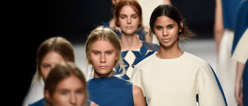 Los elementos más presentes en la colección, además de esa mezcla de azul y blanco, han sido las flores con formas geométricas, muy originalmente presentadas en diferentes puntos de las prendas, y hechas a partir de cortar la tela.