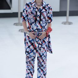 Camisa y falda con estampado de aviones de la nueva colección de Chanel primavera/verano 2016 en París Fashion WeekLos complementos definitivamente fueron elementos trascendentales para ganarse las críticas positivas de los expertos. Las pequeñas maletas de forma cuadrada eran una auténtica monada, las finas tiaras y coronas que las modelos portaban sobre el pelo hacían que cada outfit fuera todavía más especial, y además, la firma propuso un calzado adecuado para viajar de forma cómoda. Emulando a las míticas sandalias Birkenstock, la firma impuso el confort y el bienestar sobre todo para largos viajes. Algo más altas pero también confortables fueron las sandalias de plástico transparente que complementaron varios outfits.