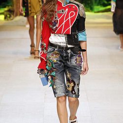 Tampoco podían faltar los trajes de chaqueta, las camisetas serigrafiadas con el logotipo de la firma, ni el animal print, tendencia de las próximas temporadas. Cabe destacar las mini faldas en varios estampados, con banderas italianas o con un dibujo de las teclas de un piano. El denim decora muchas de las prendas para los looks más casual, combinando a su vez varios tejidos.