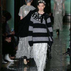 En su show otoño/ invierno 2020, bautizado como The Age of Silver (La Edad de Plata), el diseñador Erdem Moralioglu combinó telas con texturas pesadas, una paleta de color ácido y frío y estampados florales en una colección que se sentía a la vez dura y femenina. En el mundo de Erdem, la modernidad no es igual al minimalismo. Su creador hace que los brocados pesados y los adornos detallados se vean elegantes y sobrios. La lana de camello con incrustaciones de cristales se teje en múltiples patrones: como una chaqueta de traje sobre un vestido floral metálico transparente; como pantalones sueltos y como dos abrigos oversized. Le siguen distintas propuestas de vestidos de fiesta con volantes, cuadros en blanco y negro en varias escalas, zapatos planos de brocado y sedas líquidas contra el fondo verde oscuro y negro brillante de la National Portrait Gallery de Londres, un lugar al que el diseñador ha regresado desde 2018 y por todo lo alto.HOMENAJE A CECIL BEATON