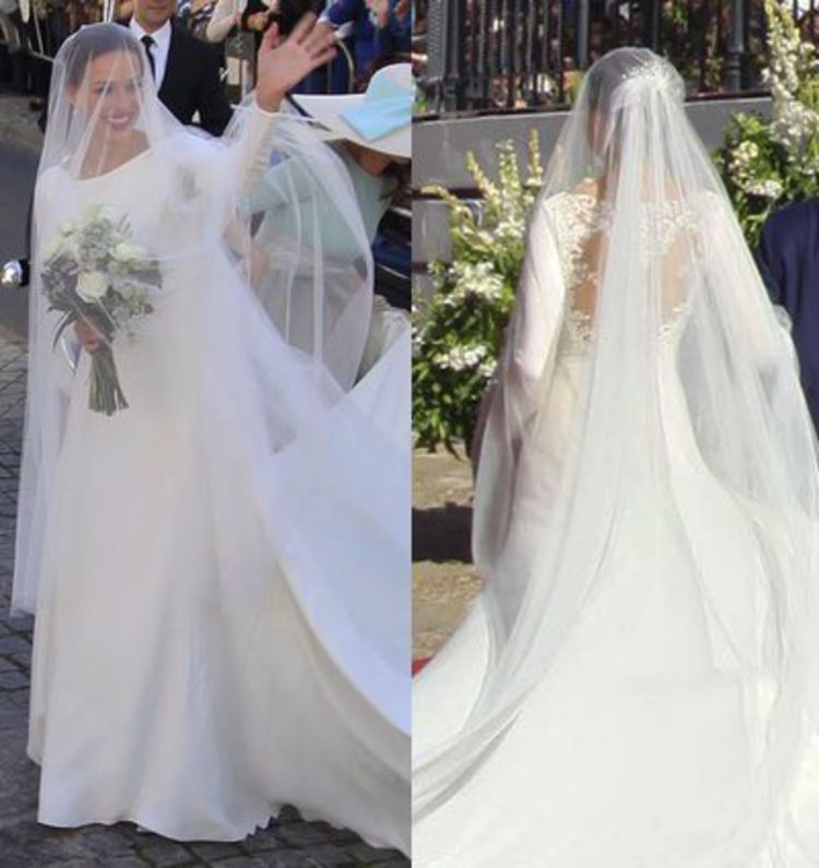 Para completar su look, la presentadora de 'Masterchef' ha lucido un velo clásico con el que se tapaba la cara antes de entrar a la Iglesia y que se superponía sobre la larguísima cola con la que terminaba el primero de los dos vestidos que va a lucir Eva González.