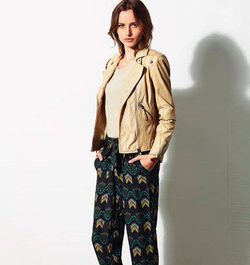 Chaqueta de cuero beige y pantalón étnico de Javier Simorra (2014)Javier Simorra presenta su nueva colección para primavera/verano 2014, y lo hace inspirándose en una mujer enérgica y libre, cuyo interés es que sus prendas se adapten a sus estilo de vida. Los diseños de esta colección tienen influencia de los cinco continenentes para aportar a nuestros armarios aires nuevos, con la intención de renovar nuestras prendas preferidas sin cambiar su estilo.