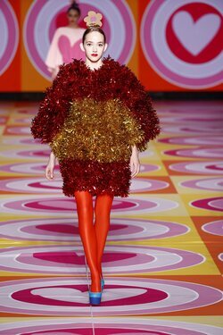 Modelo con un abrigo oversize estampado con la bandera de España de la colección otoño/invierno 2022 de Ágatha Ruiz de la Prada en ma MBFW Madrid.
