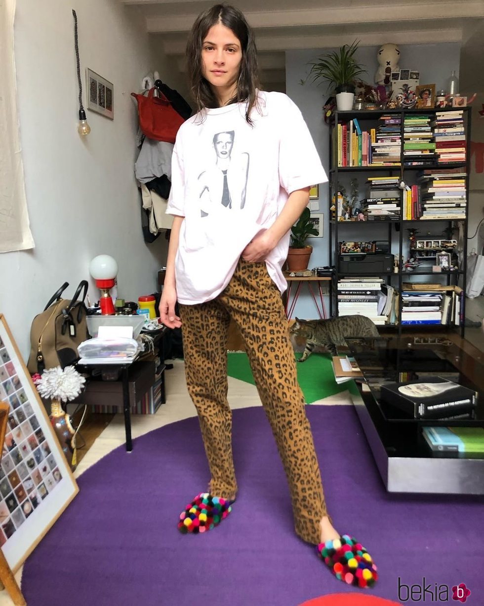 La modelo gallega, Alba Galocha, con un camiseta blanca oversize con la fotografía de Bimba Bosé, pantalón estampado animal print y zapatillas de andar por casas en múltiples colores en su propia casa durante la cuarentena por el coronavirus.
