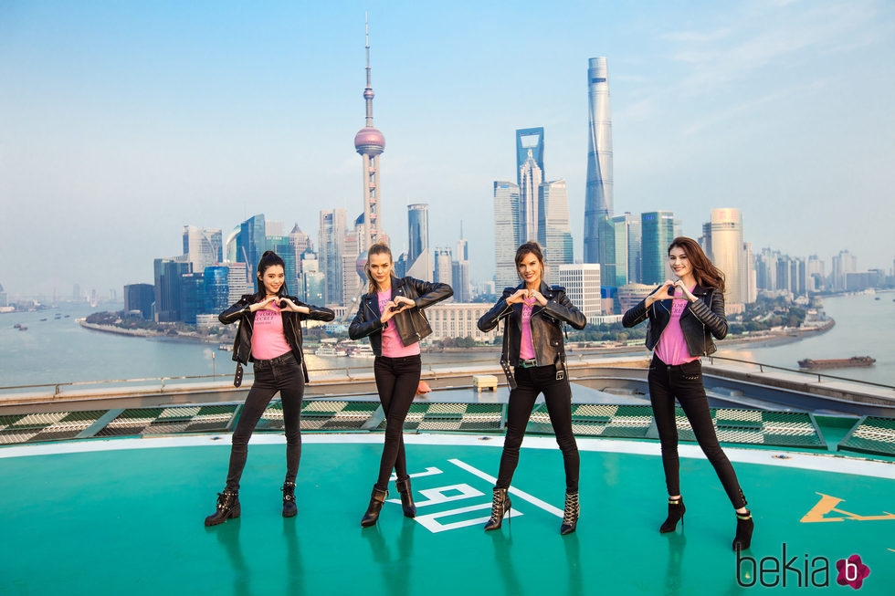 Alessandra Ambrosio, Josephine Skriver, Sui He y Ming Xi posando en China para promocionar el nuevo Fashion Show de Victoria's Secret.