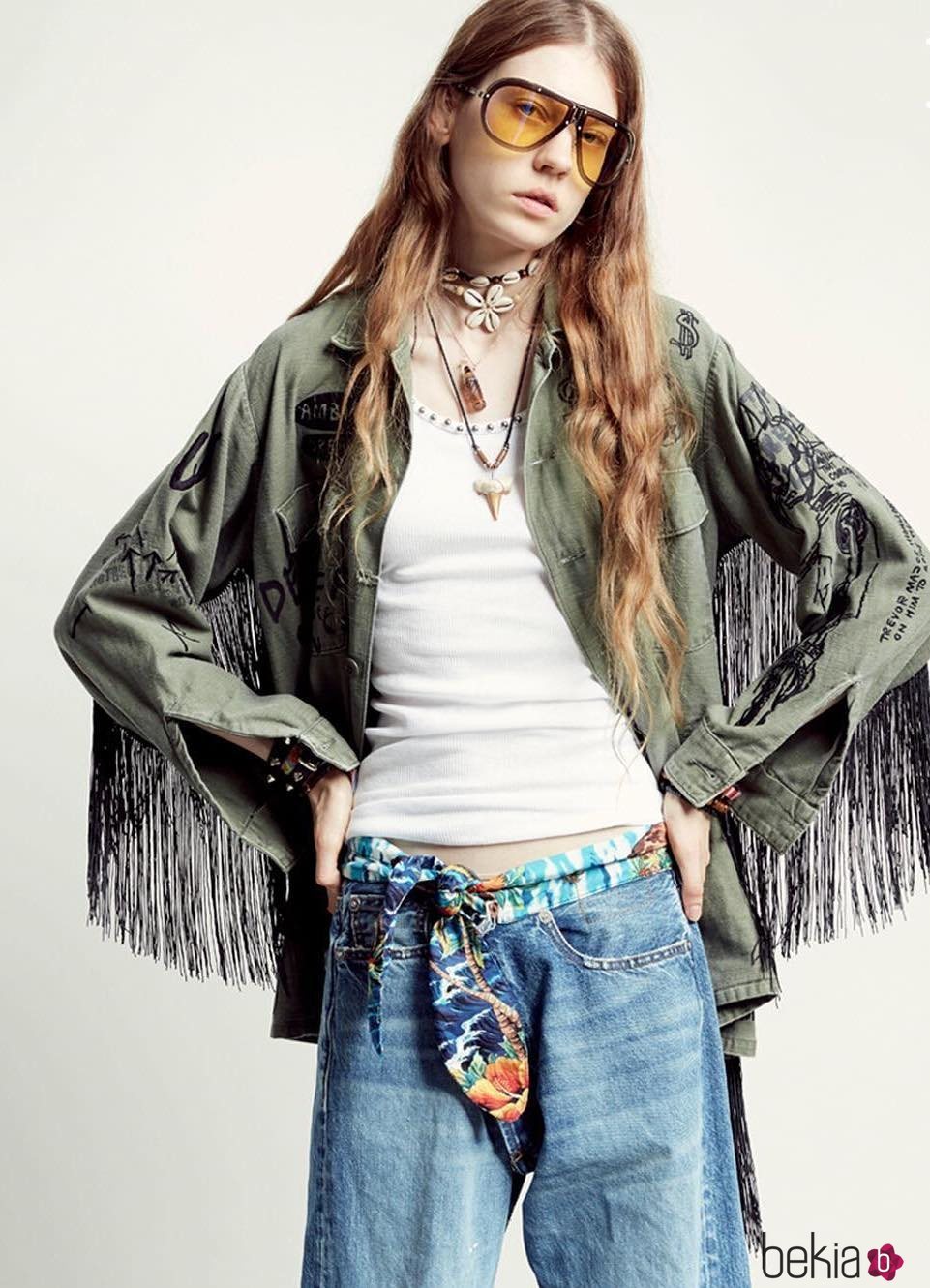 Cazadora en tono verde militar con detalles de flecos en las mangas de la nueva colección de la firma americana R13 Denim.