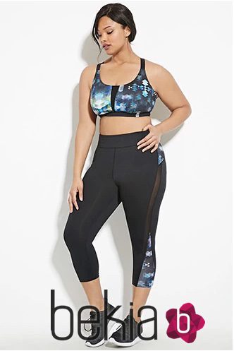 Cropped top azul estampado y mayas negras de Forever 21 para su línea deportiva de tallas grandes