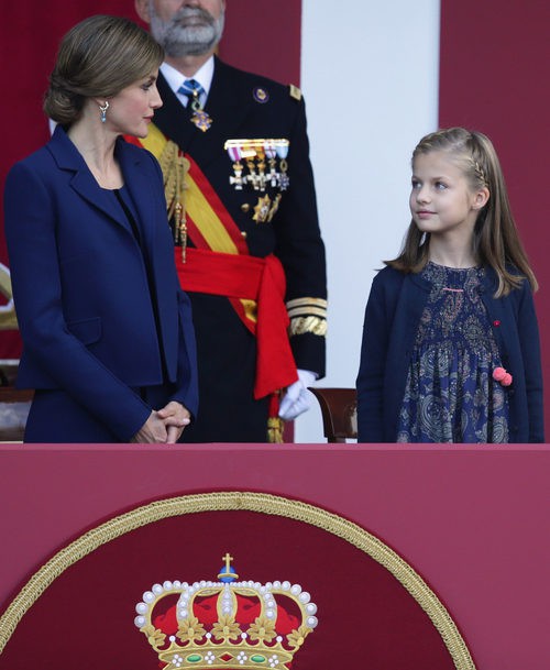 Doña Letizia con su traje de Felipe Varela azul marino junto con su hija la Princesa Leonor