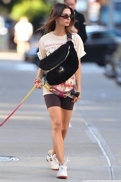 La modelo Emily Ratajkowski paseando a su perro por las calles de Nueva York con un look deportivo del que destaca la riñonera gigante.