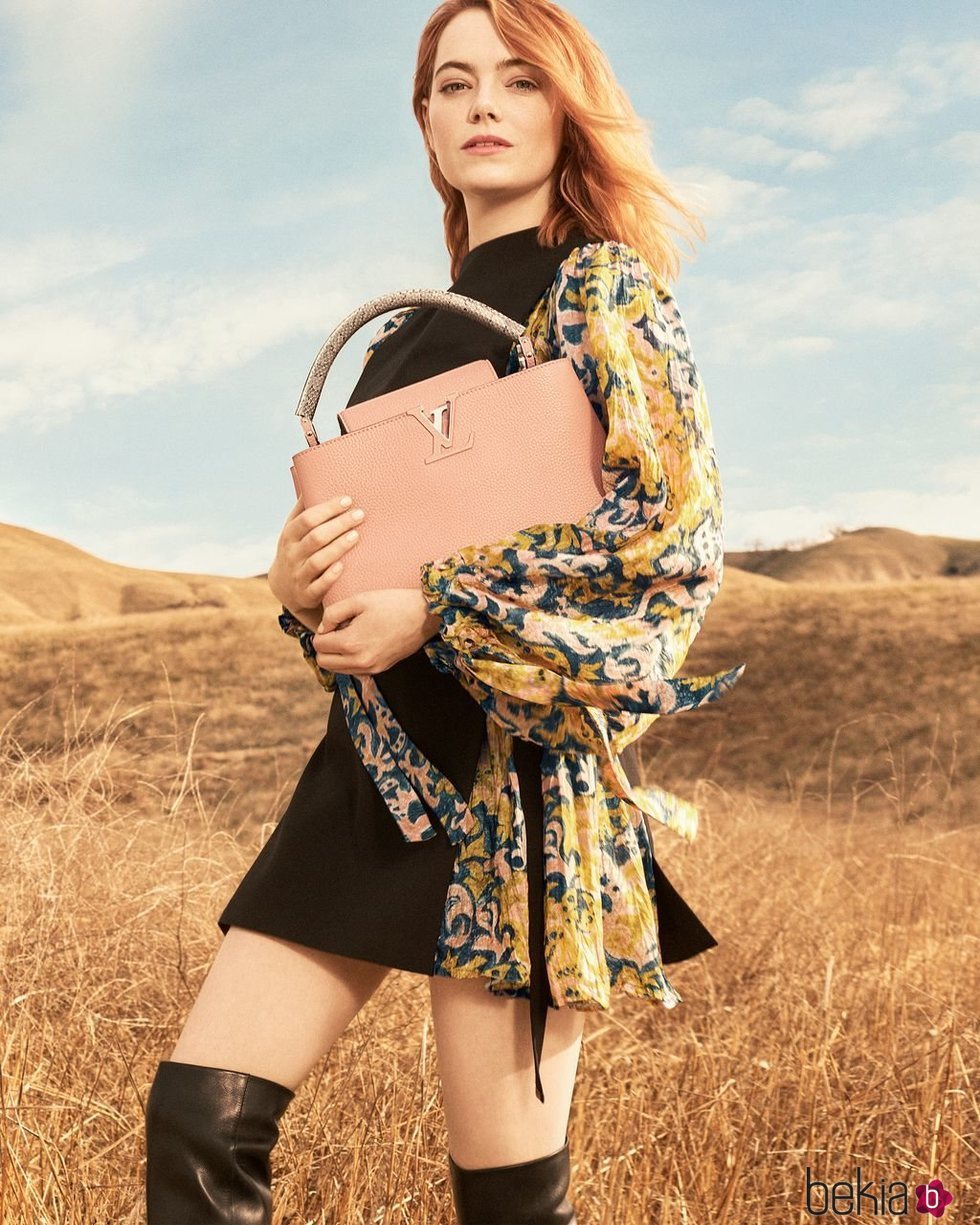 La actriz posa con un vestido que combina el estampado de flores con franjas negras, junto con un bolso rosa palo.