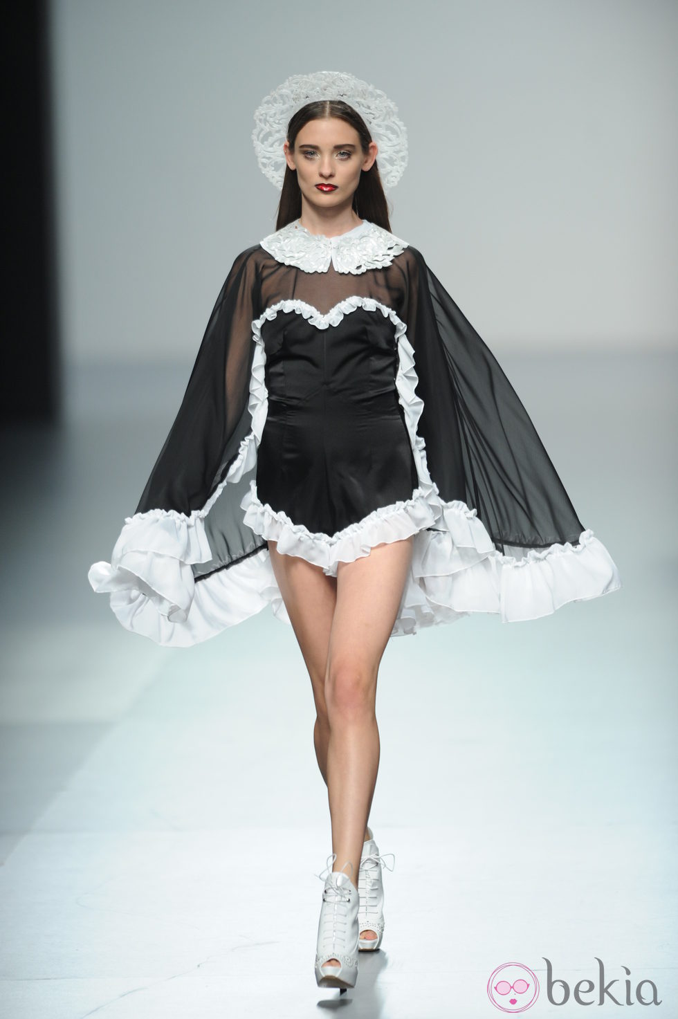 Modelo en blanco y negro con escote corazón y capa de Carlos Díez, colección primavera 2012.