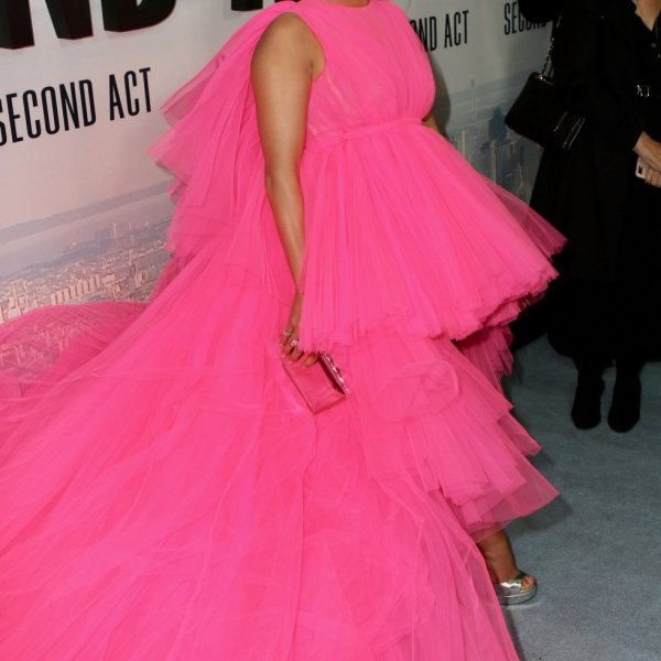 La actriz y cantante ha posado con un vestido rosa pomposo en la premiere de su película 'Second Act'.
