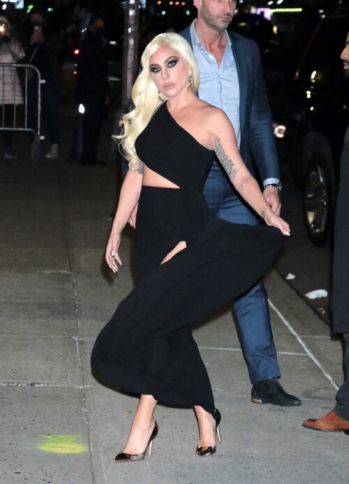La cantante Lady Gaga llegando a'The Late Show with Stephen Colbert' con un vestido de la coleción primavera/verano 2022 de Valentino.