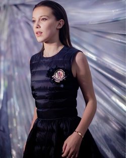 Millie Bobby Brown con un vestido acolchado de tirante ancho en color negro con el logo de la firma italiana Mongler en el lado izquierdo en forma de parche