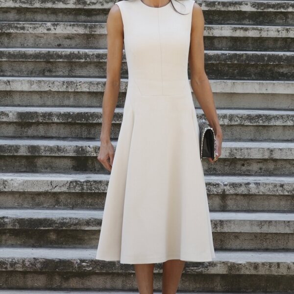 La Reina Letizia acudió a la inauguración de la exposición 'Emilia Pardo Bazán. El reto de la modernidad' en la Biblioteca Nacional con un vestido de Pedro del Hierro que había vestido ya en 2019.