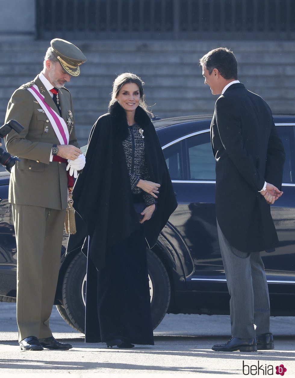 La Reina Letizia cubierta con una capa oscura a su llegada al solemne acto de la Pascua Militar 2019 en el Palacio Real de Madrid.