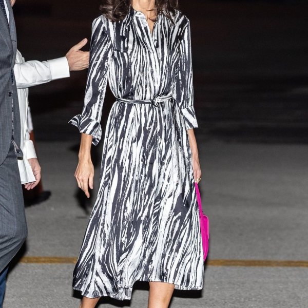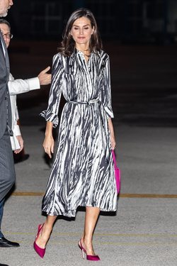 La Reina Letizia con vestido animal print en estampado zebra de Hugo Boss con stilettos de Carolina Herrera en su llegada a La Habana.