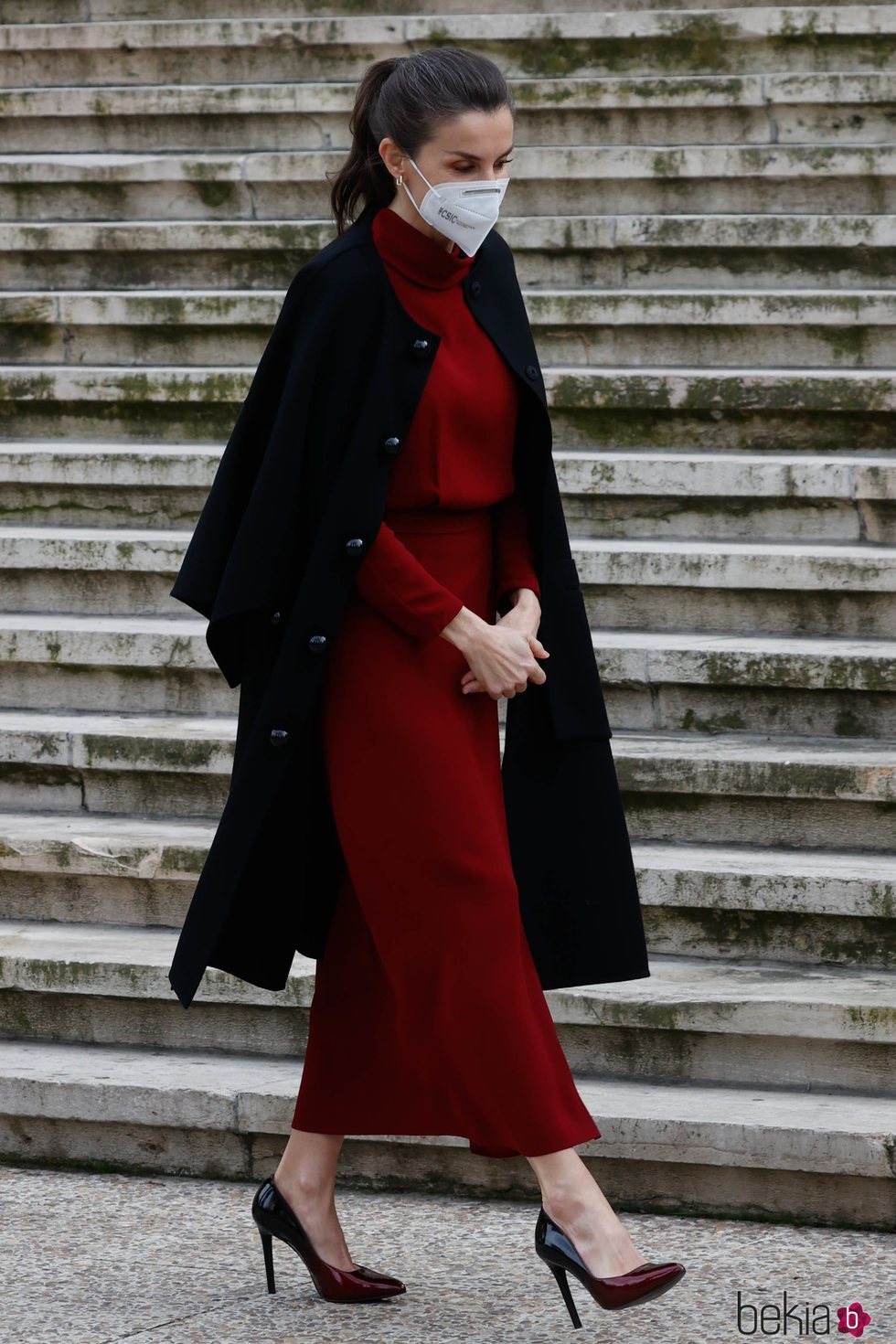 La Reina Letizia lució en su visita a la exposición Concepción Arenal. La pasión humanista 1820-1893 que acoge la Biblioteca Nacional de España un vestido en color burdeos con cuello alter y patrón fluido largo midi.