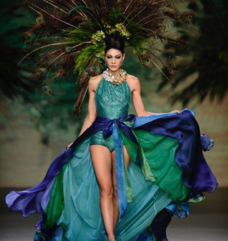 Y bajo este leitmotif nos encontramos con las diferentes propuestas del modisto, que comenzaron con una serie en tonos neutros de prendas que, como no podía ser de otra forma, estaban elaboradas en seda. Colores como beiges crudos y verdes apagados en estampados de plumas de pavo real fueron los protagonistas de la primera serie de propuestas, que llegaron tanto para hombre como para mujer y que dieron el relevo a tonos azules verdosos, azules marinos y tejidos como el terciopelo.
