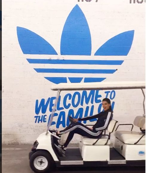La modelo dio a conocer esta noticia a través de una publicación en su Instagram, en la que colgó un boomerang en el que iba vestida de la cabeza a los pies por esta firma y conducía un carrito de golf delante de un mural en que se veía claramente la frase "¡bienvenida a la familia!" y en la que pusó como título "oficialmente me uno a la familia de Adidas".Se trata del primer gran contrato que recibe Kendall Jenner, tras el criticado spot que realizó en colaboración con la conocida marca de refrescos Pepsi. Para evitar la controversia, la marca deportiva se ha manifestado al respecto comentando que