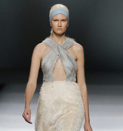 Los colores, como apuntábamos, han sido sin duda muy luminosos. Tonos maquillaje, como el nude, el rosa palo, el gris perlado o el azul cielo han destacado por encima de los demás. Otra de las propuestas de Moisés Nieto en cuanto a los tonos han sido los metalizados, un recurso que aportaba el punto actual e innovador a los looks retro de Moisés Nieto.