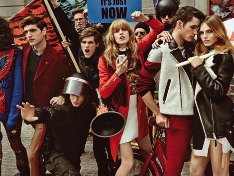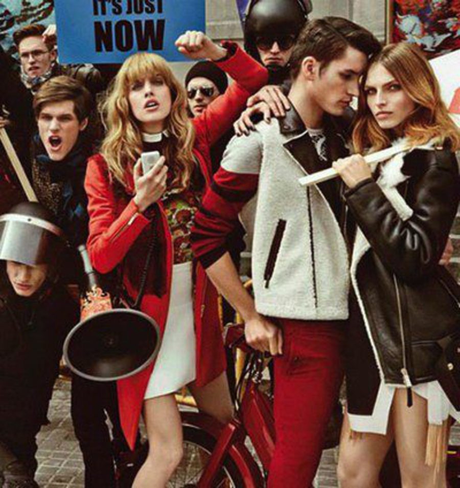 Campaña de promoción de la colección otoño/invierno 2013/2014 de Roberto Cavalli La campaña, que se ha llevado a cabo en la ciudad de Barcelona, toma como protagonistas a los manifestantes: un conjunto de modelos que acudieron a una protesta vestidos con las prendas de la firma para posar frente al objetivo de Giampaolo Sgura y quien hizo unas fotografías en las que no faltan las pancartas, los altavoces y los policías.