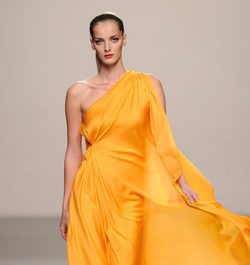 Vestidos con crep de seda, tejidos tecnológicos cargados de colores alegres como el amarillo mostaza o el naranja han predominado en la pasarela madrileña. " Mis propuestas son de fiesta, he querido trabajar patrones para eventos especiales, las líneas más de sport ya se hacen muy bien y a precio muy asequibles", ha dicho a EFEstilo Torreta.