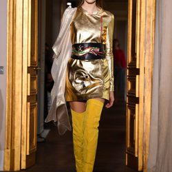 El toque dorado en chaquetas y vestidos -incluso en un vestido dorado con un cinturón XXL con un dragón chino estampado- y las botas leggings en verdes y amarillos han puesto el toque final al primer desfile de esta edición de la Semana de la Alta Costura parisina.