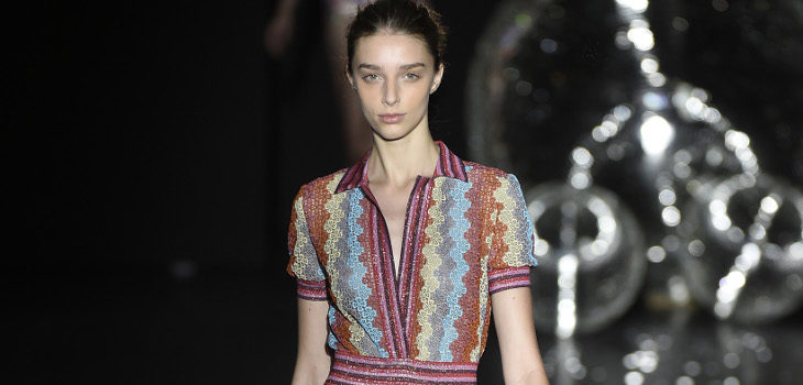 Traje de pantalón inspirado en la música disco de Teresa Helbig primavera/verano 2017 en Madrid Fashion WeekLos estampados de pedrería y brillos son como llevar a la discoteca contigo, aunque tampoco han faltado los tejidos de gasa, que aportan transparencia, frescura y mucho movimiento a la ropa. Los shorts son sido, una vez más, una prenda clave en esta colección de Teresa Helbig, lo más común junto a los vestidos. En un inicio la inspiración es totalmente disco, con muchos brillos que traen colores, y prendas metalizadas y un poco rock.