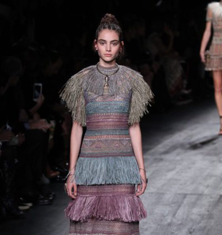 Vestido largo con flecos de la colección de primavera/verano 2016 de Valentino en París Fashion WeekLa paleta de colores también transportaba a la selva, con una variación de tonos naranjas, verdes, marrones, negros y burdeos que recordaban a las maravillas de este ecosistema. Otro detalle a destacar fueron los collares de grandes dimensiones que parecían estar hechos de huesos y el pelo también conjuntaba con el estilo general del desfile, al llevar las modelos trenzas pegadas a la cabeza, peinado típico de mujeres de piel negra.