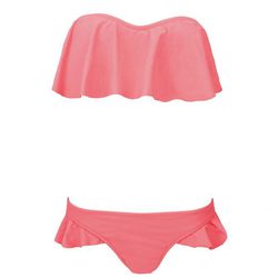 Los volantes serán el detalle que adorne tu bikini liso monocolor, dándole un toque divertido y siguiendo la moda que arrasa en las playas. Hay dos tipos de patrón para el sujetador, el corte top con tirante ancho y el de escote corazón, pero ambos diseños están trabajados con refuerzo interior para estilizar tu silueta. Están disponibles en colores pastel como el rosa palo o el aguamarina, y en tonos más intensos como el azul celeste o amarillo cítrico.